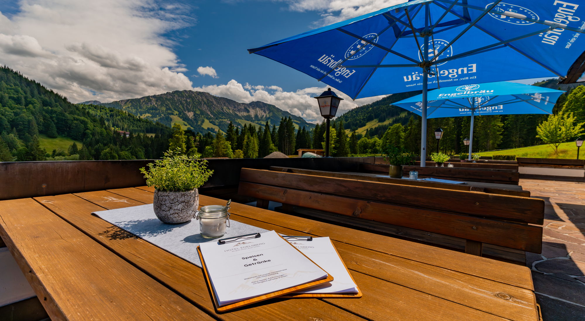 Die großzügigen Terrasse, direkt am Hotel lädt dazu ein dem Alltag mit herrlichem Blick in die Berge zu entfliehen. Hier servieren wir Ihnen gerne hausgemachte Kuchen, Kaffeespezialitäten, kühle Getränke und mehr.